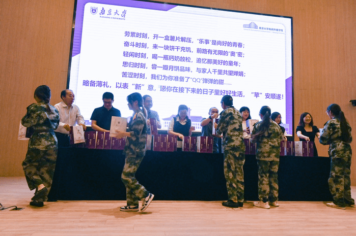 接下来是军训慰问环节,伴随着活泼的音乐声,同学们依次上台领取国产直播